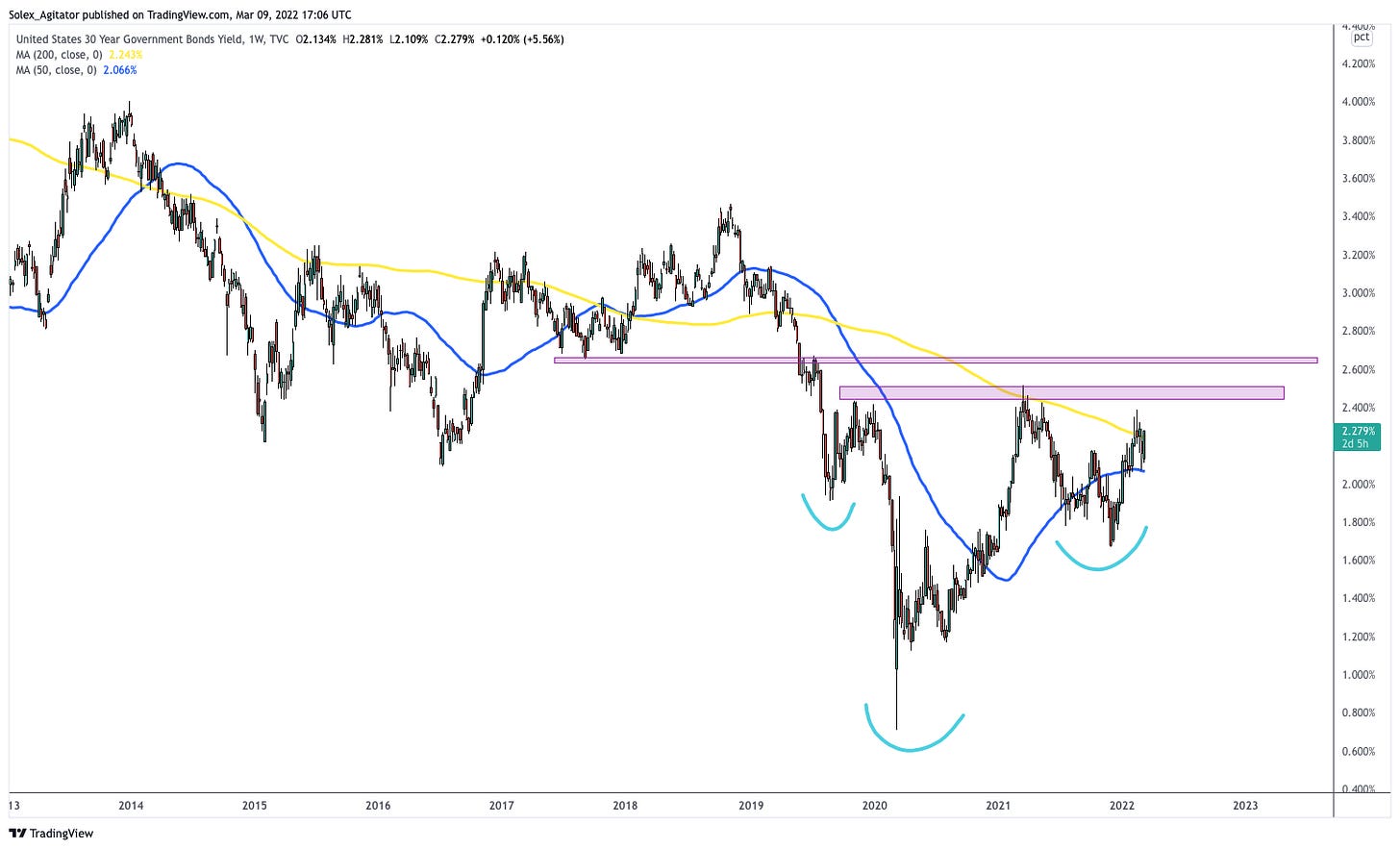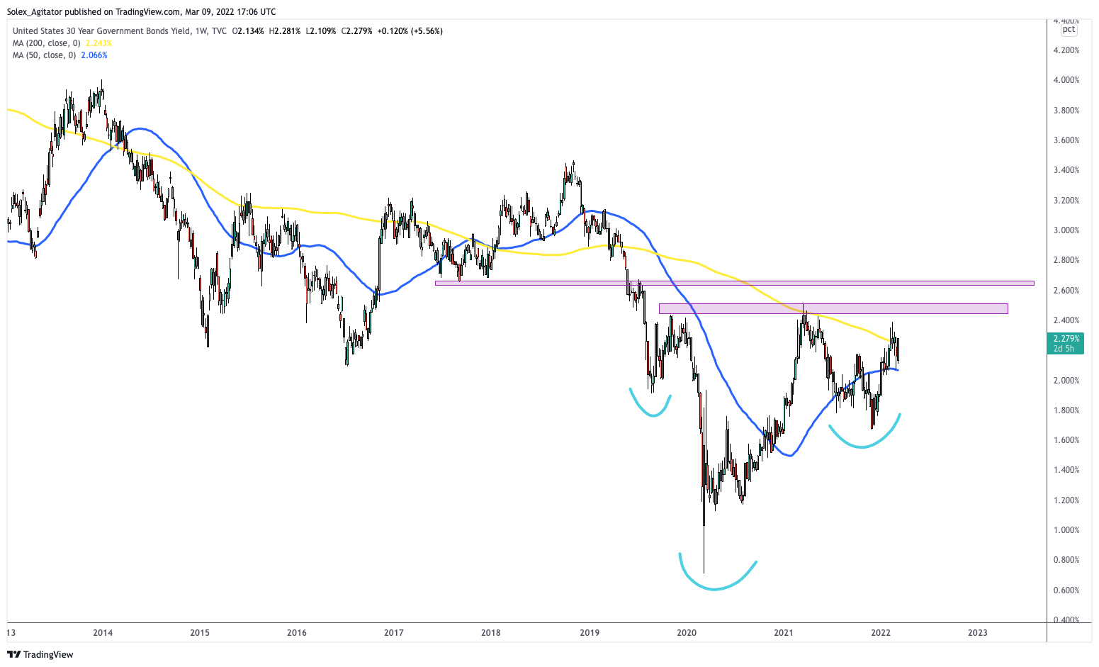 The 30yr on the weekly seems to be lagging behind the price action of the 10yr, and has resistance zones ahead (2.44-2.50 zone & 2.63-2.66 zone) it needs to clear before heading to its target of 4.00% in the next 12-18 months.