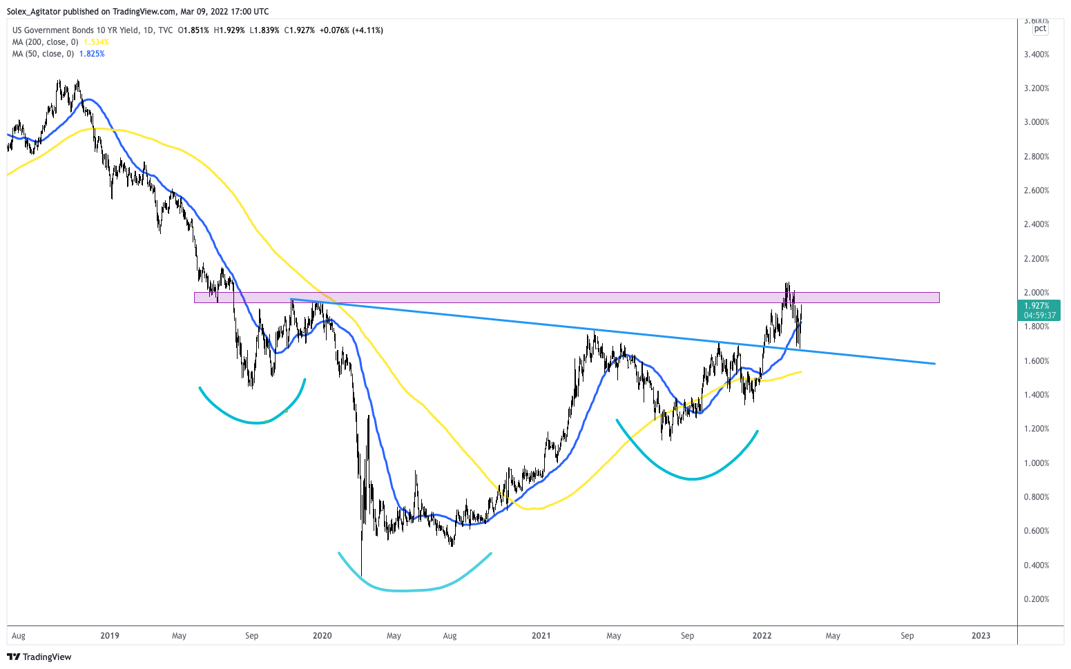 The 10yr on the daily chart is looking strong, and a test and hold above the 2.00% zone should open up a move towards 3.00% in the next 12-18 months
